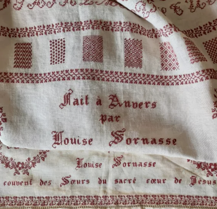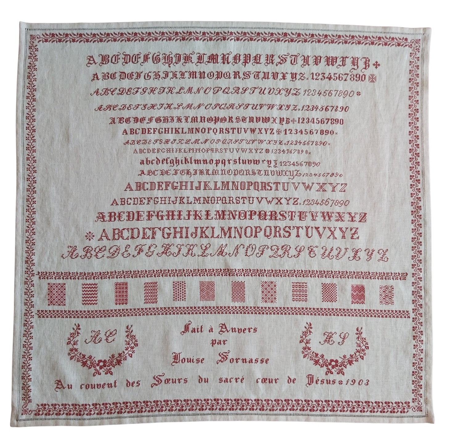 Louise stitched her monumental Belgian sampler in 1903 at the Couvent des Sœurs du Sacré-Cœur de Jésus in Antwerp. The original sampler belongs to Annelies van den Bergh, who charted the design and stitched the model. Soed Idee is honored to publish this beautiful pattern on her behalf.
