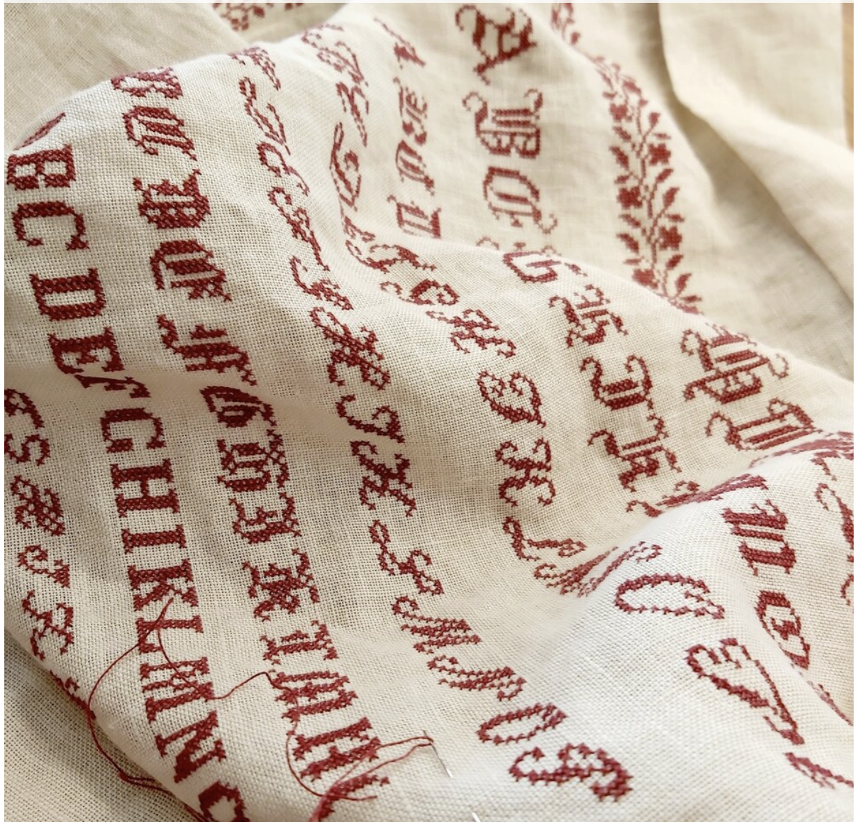 The design measures 636 × 596 stitches – about 92 × 86 cm (36 × 34 inches) on 36-count linen – filled with graceful alphabets, borders, and beautiful open hemstitch work.